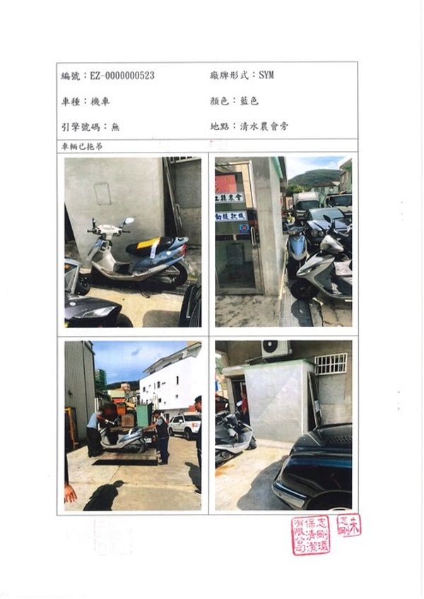 一、查報編號:EZ-0000000523,查報日期:110年5月3日,廠牌:SYM,顏色:藍,車種:機車,牌照號碼:無,查報地點:清水農會旁。