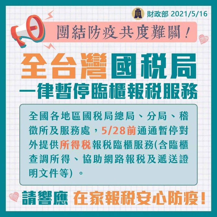 全台灣國稅局一律暫停臨櫃報稅服務