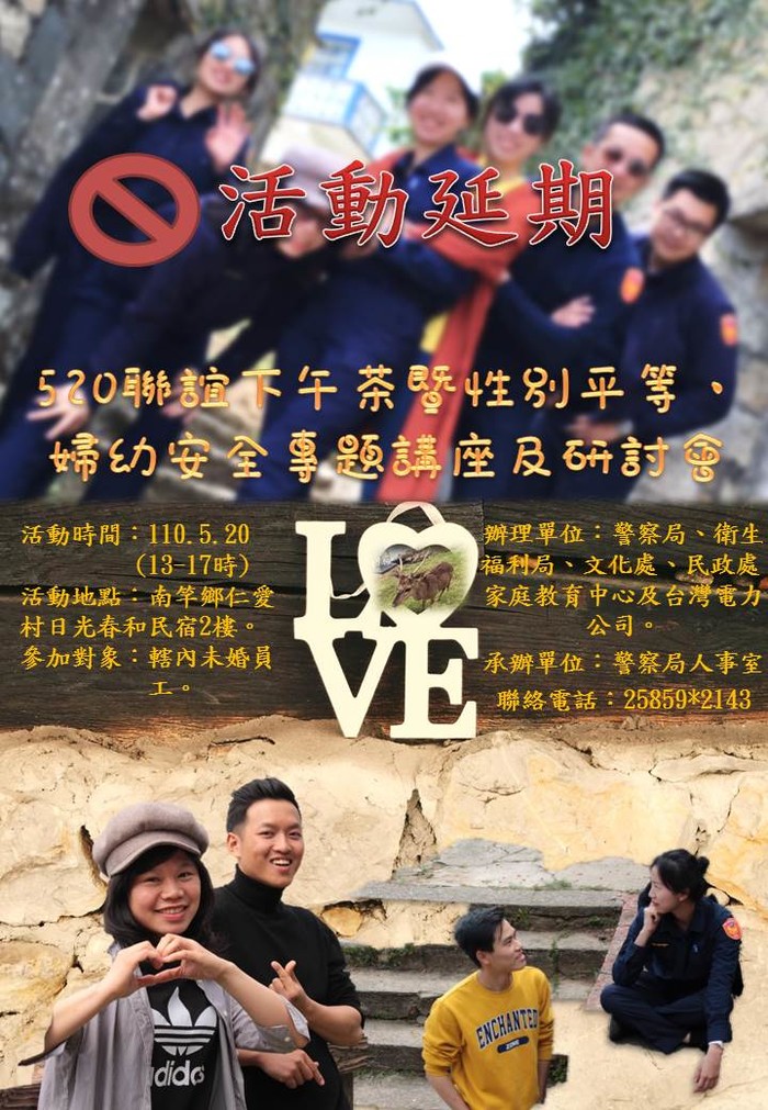 因應中央流行疫情指揮中心宣布COVID-19(新冠肺炎)疫情嚴峻,為顧及民眾健康及安全考量,並降低縣民染疫風險,原預定110年5月20日(四)於連江縣仁愛村日光春和辦理「520聯誼下午茶暨性別平等婦幼安全專題講座及研討會」,將延期辦理,待疫情趨緩後擇日復辦,造成您的不便,敬請見諒。
