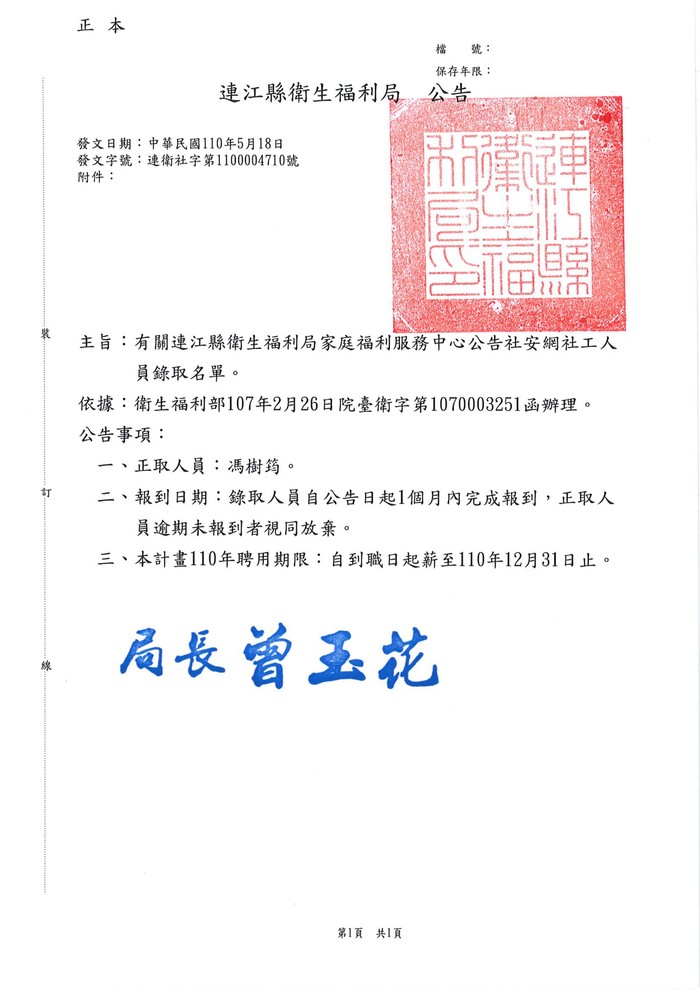 衛生福利局錄取人力公告