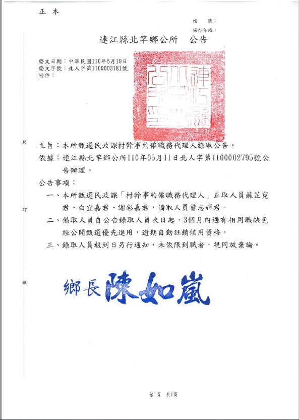 北竿鄉公所村幹事約僱職務代理錄取公告