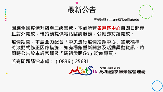 六、各場館重新開放及活動異動資訊,將即時公告於本處官網及「馬祖愛趴Go」粉絲專頁,敬請密切關注。