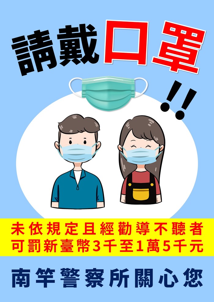 二、戶外須全程佩戴口罩,經勸導不聽者,可處新台幣3千元以上1萬5千元以下罰鍰!