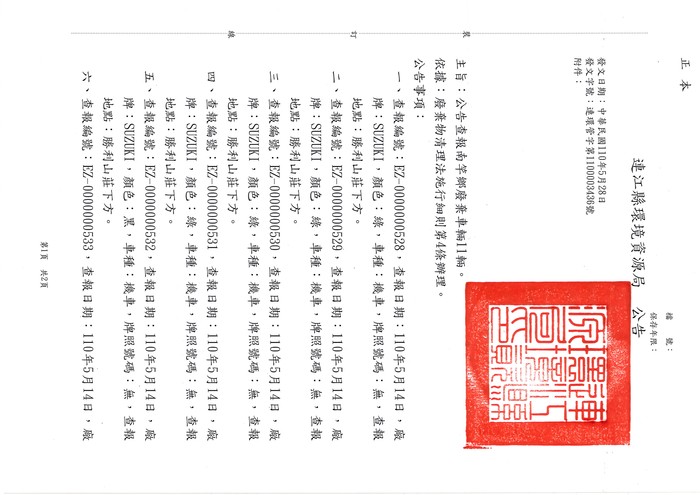 十二、以上車輛如有車主,請於110年7月1日前至本局辦理領回手續,逾期視同廢棄物回收處理。