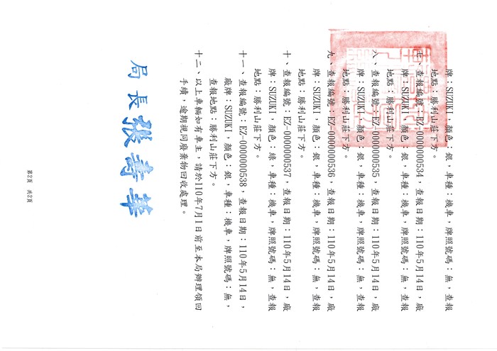 十一、查報編號:EZ-0000000538,查報日期:110年5月14日,廠牌:SUZUKI,顏色:銀,車種:機車,牌照號碼:無,查報地點:勝利山莊下方。