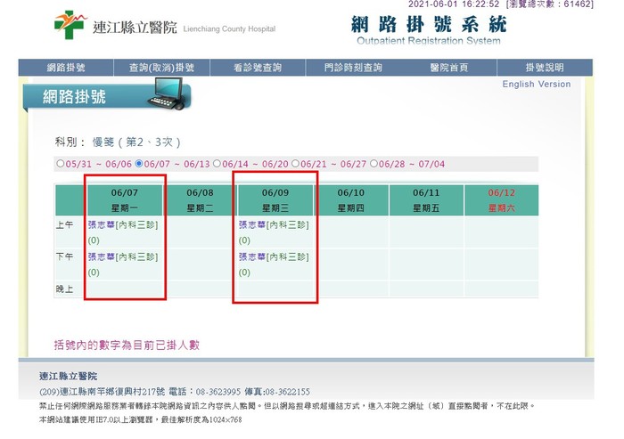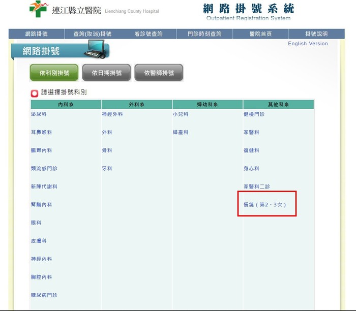 敬請於本院網路掛號系統http://ljc.matsuh.gov.tw/OINetReg/