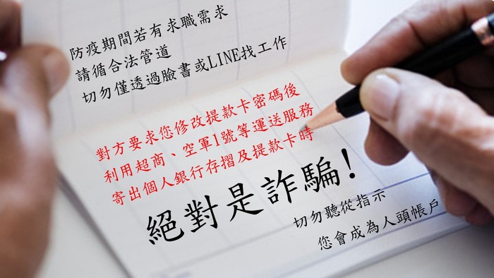 疫情期間有求職或借貸需求,請洽合法管道,僅透過臉書或LINE與對方詳談,甚至要求您寄出個人存摺與提款卡,請小心,絕對是詐騙!
