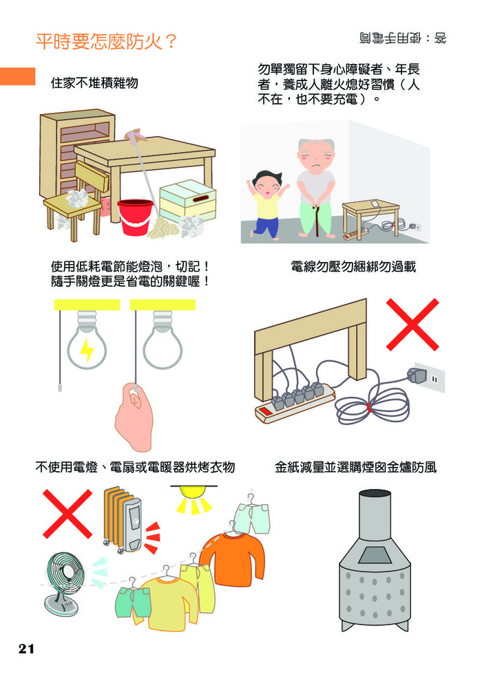 減少家中可燃物及雜物之堆放,避免爆竹煙火及焚燒紙錢引發火災。