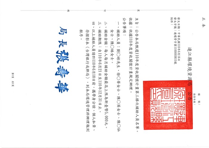 四、以上補助人員請於110年6月18日前,攜帶身分證、個人私章、存摺影本(台灣銀行或郵局),到本局環境管理科辦理報到程序。