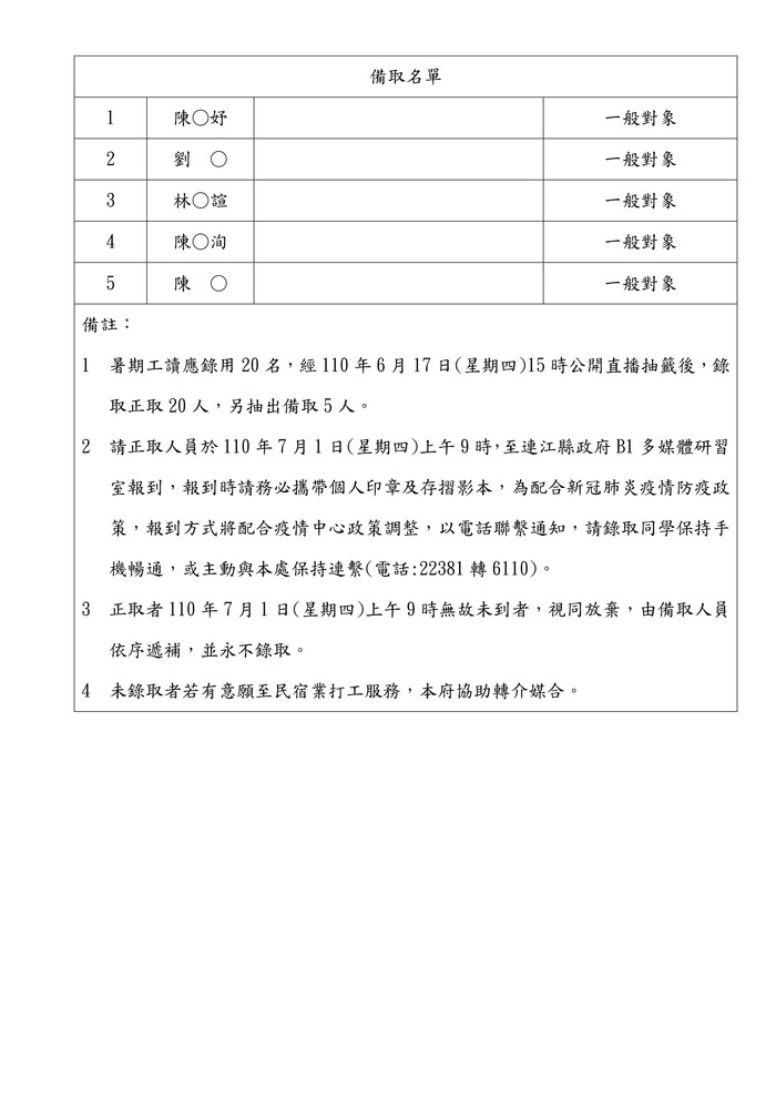1暑期工讀應錄用20名,經110年6月17日(星期四)15時公開直播抽籤後,錄取正取20人,另抽出備取5人。