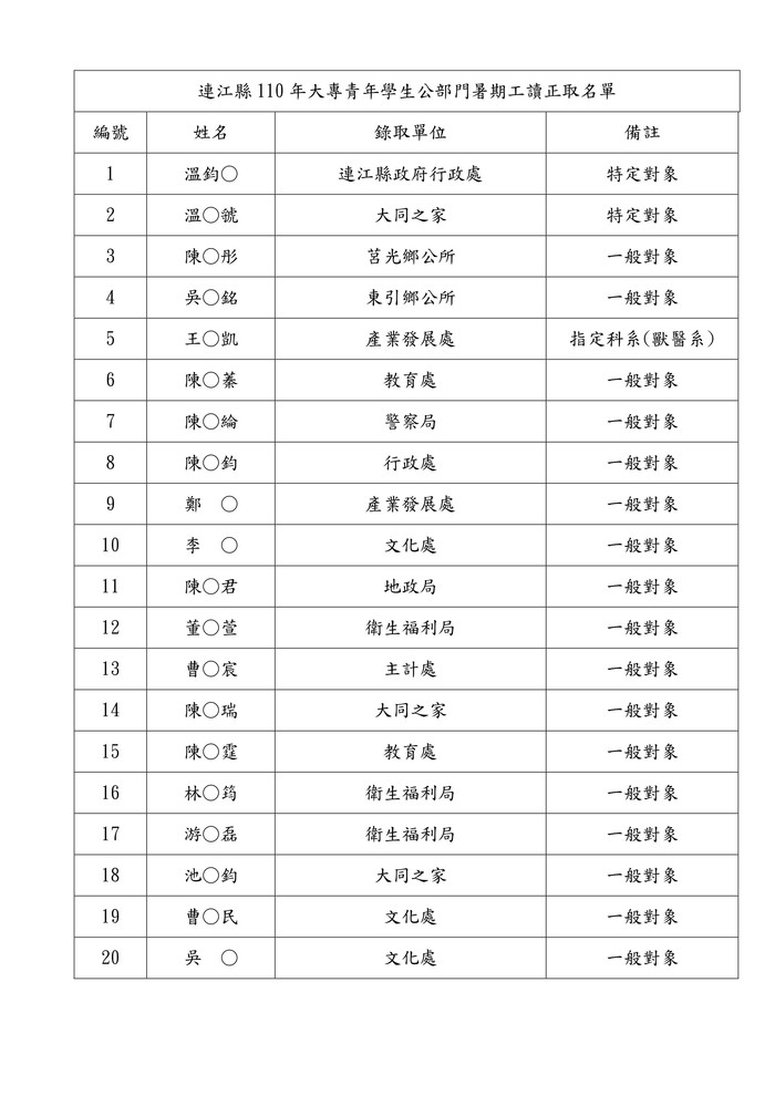 大專學生公部門暑期工讀錄取名單 --閱讀人次 : 1332