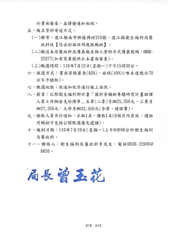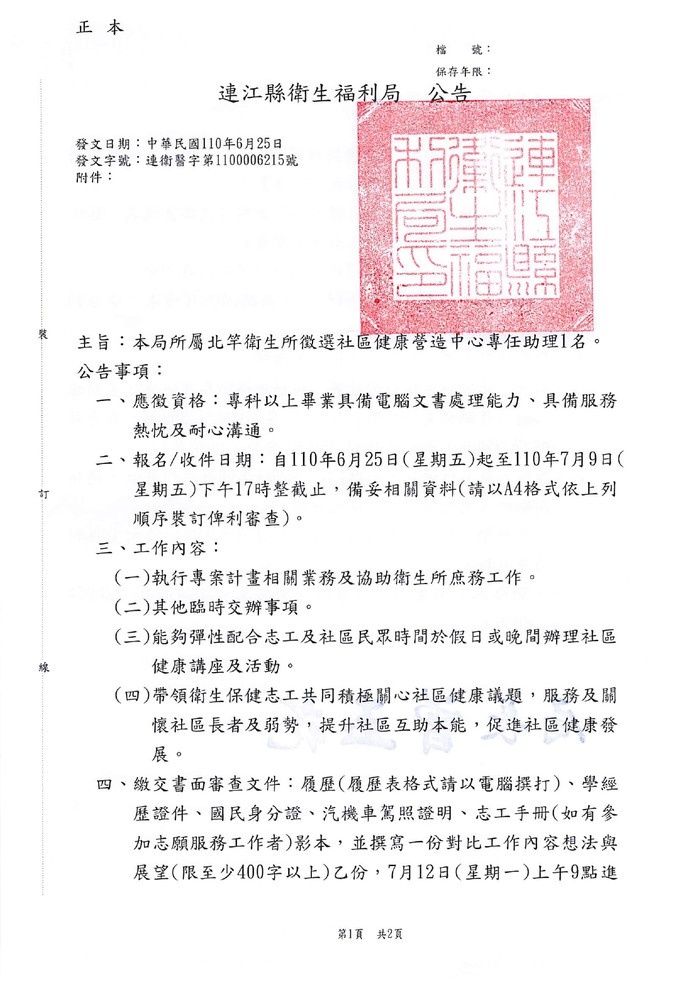 衛福局第三次徵選北竿社造專任助理一名
