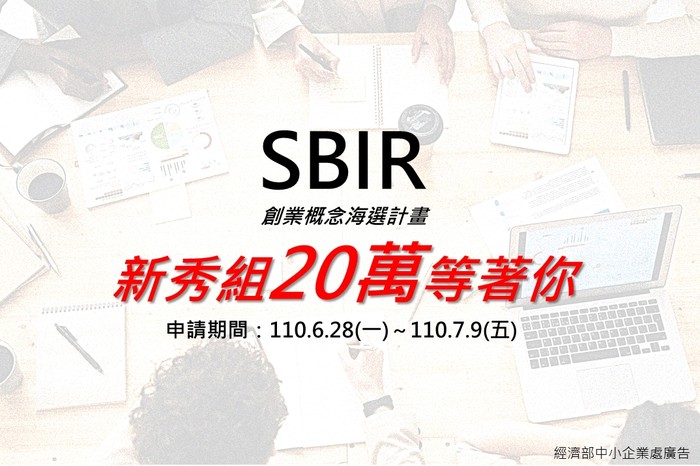 110年度「創業型SBIR-創業概念海選計畫(新秀組)」已公告徵件並訂於6月28日(一)上午9時起至7月9日(五)下午5時30分止開放線上收件,本年預計遴選100案,每案提供20萬元獎勵金,倘對於本計畫推動需近一步相關諮詢,請洽0800-888-968,或計畫官網https://www.sbir.org.tw/。