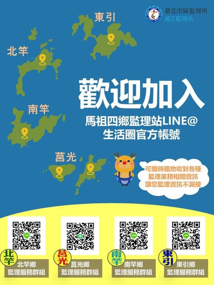 連江監理站為了給您貼心的服務,分別建置了南竿、北竿、莒光及東引四鄉的LINE群組,就如同您的小秘書提供更多監理資訊,不論是愛車檢驗、駕照審驗通知及交通新法規等皆會零時差推播最新資訊,服務歡迎你掃瞄加入,還有LINE@的1對1的提問噢。