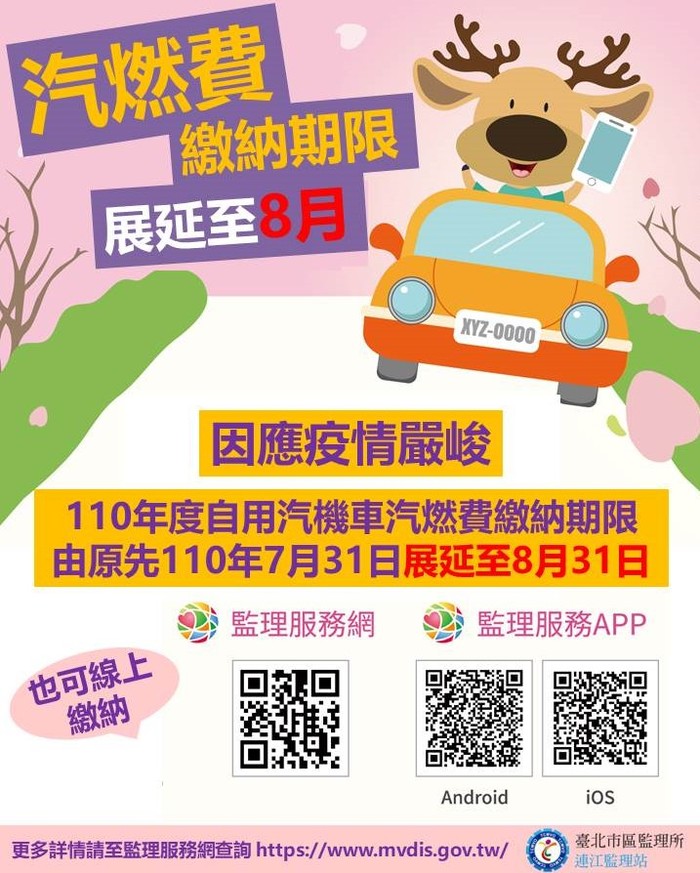 防疫避群聚汽燃費繳納期限延至8/31 --閱讀人次 : 687 防疫避群聚 汽燃費繳納期限延至8/31
