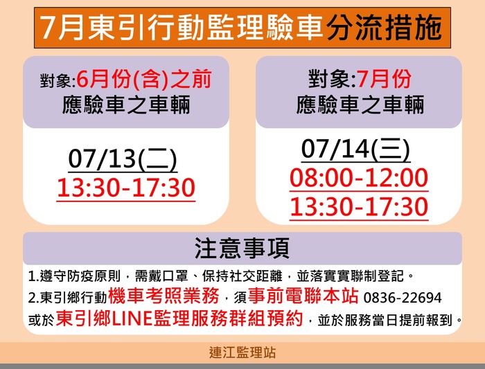 對象:7月份應驗車之車輛:07/14(三) 08:00-12:00、13:30-17:30