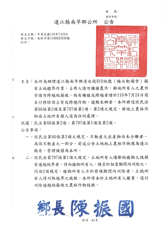 南竿清水段910地號土地鑑界作業公告