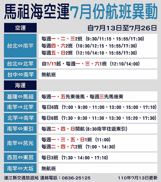 馬祖海空交通7/13-7/26航班表