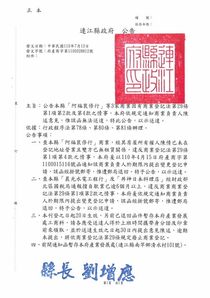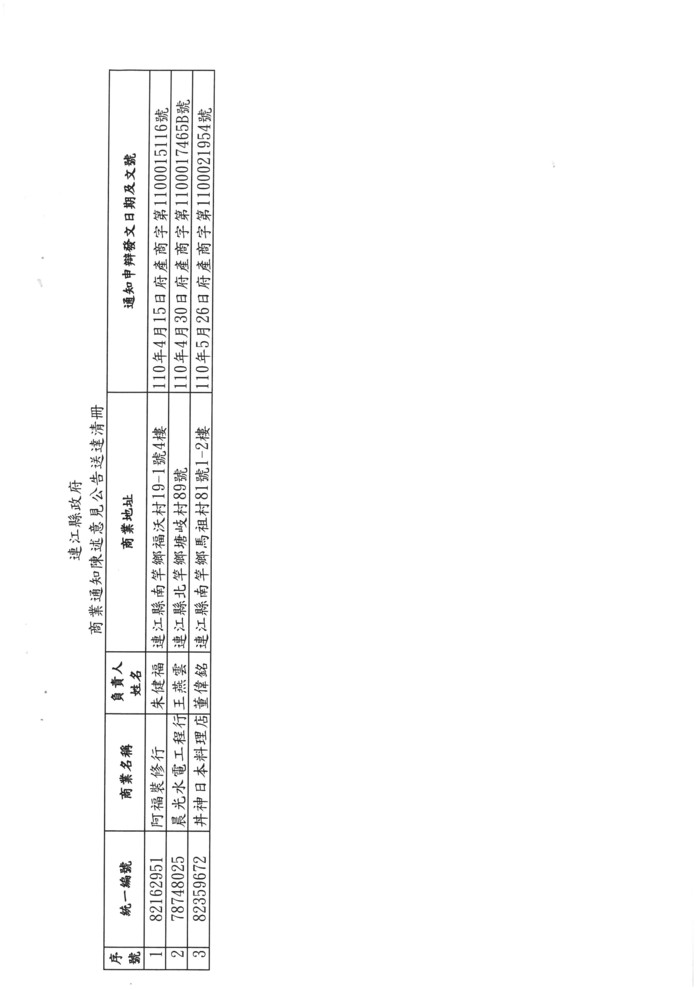 公告送達本縣3家商業陳述意見通知