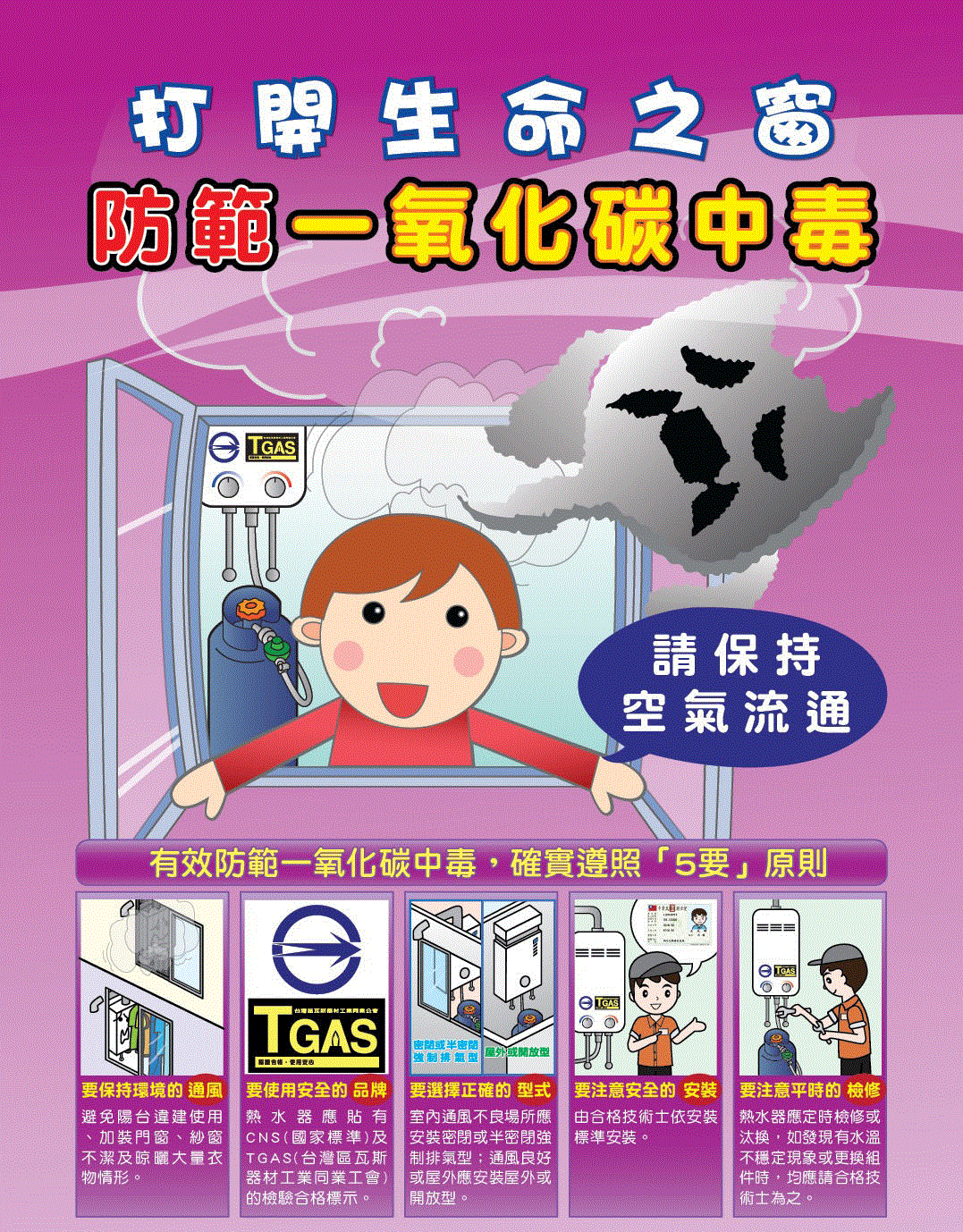 當我們聞到瓦斯外漏的氣味時,會意識到危機而趕緊處理。然而真正的隱形殺手-「一氧化碳」,卻往往會因其具有無色、無味的特性而遭忽視,以致不幸事故層出不窮。如何有效防範一氧化碳中毒,請確實遵照「五要」原則,是不二法門。