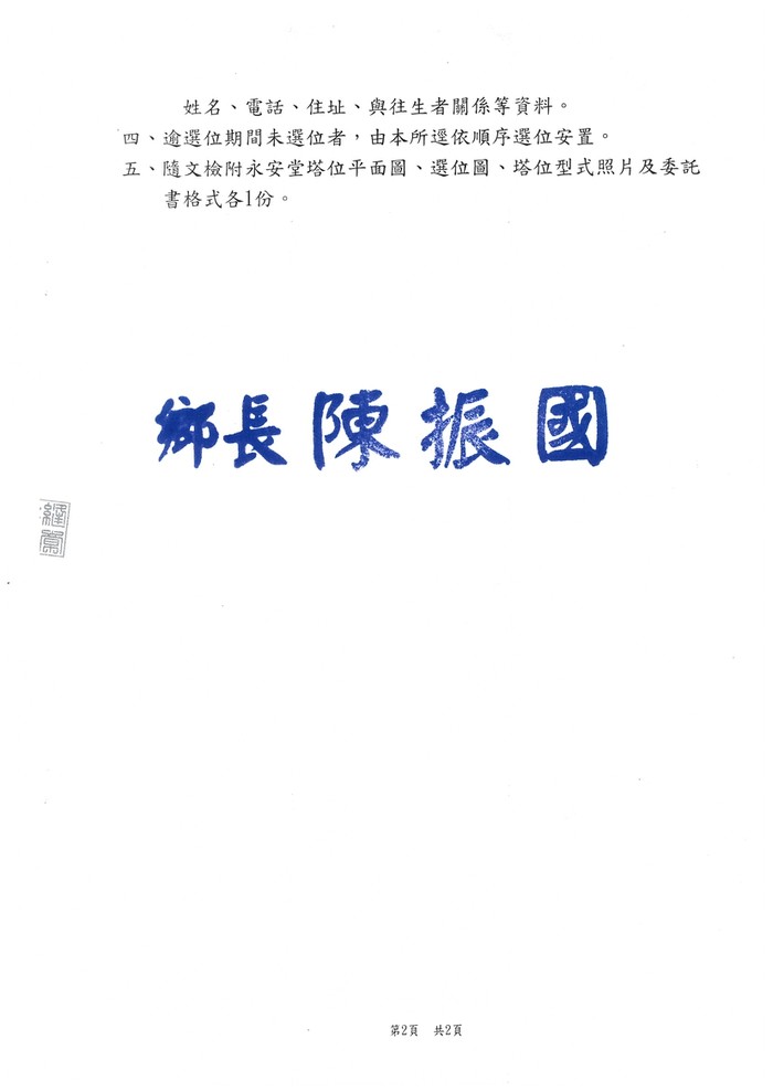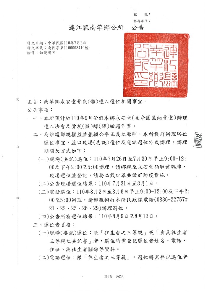 南竿生命園區永安堂骨灰骸遷入選位公告