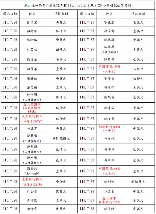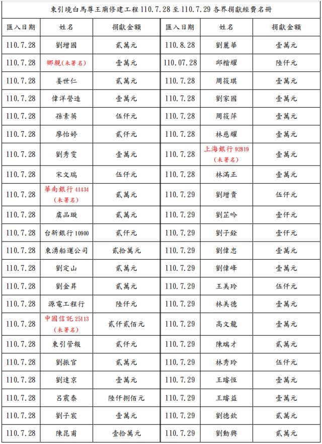 東引境白馬尊王廟修繕工程,繼續受到本鄉鄉親、各地旅台鄉親及各位善信朋友熱烈支持,踴躍贊助修繕經費,管委會對各位善舉表示由衷感謝。茲賡續將7月27日至7月30日所捐獻匯入款項更新公布如后,以昭公信,感恩大德,謝謝。