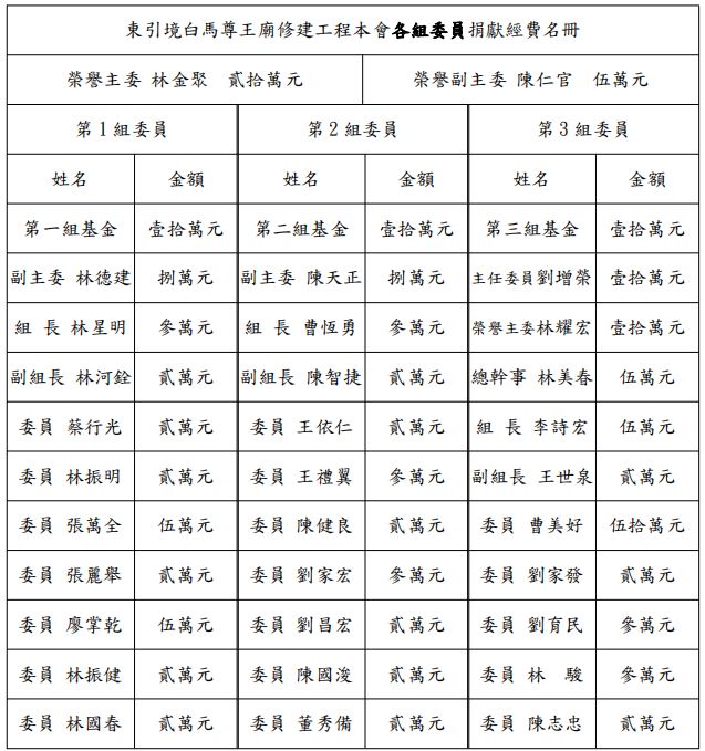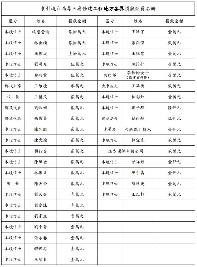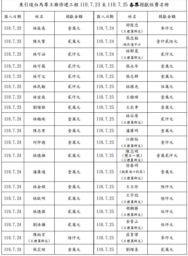 7/30東引白馬尊王修繕捐款芳名錄 --閱讀人次 : 1712 各位鄉親善信大家好:
