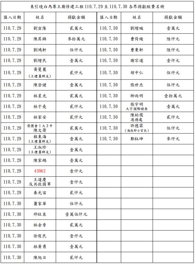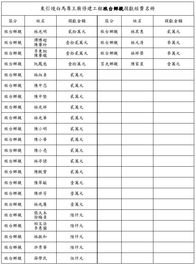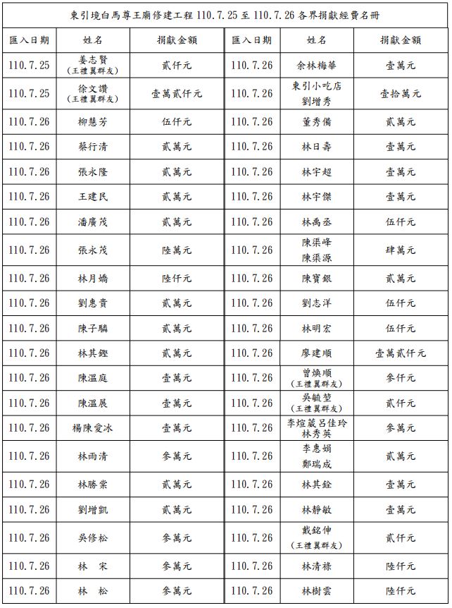 附加Word文件檔: 東引境白馬尊王廟修建工程捐獻經費1100730更新名冊.doc