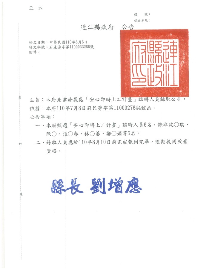 連江縣政府產業發展處「安心即時上工」臨時人員錄取公告