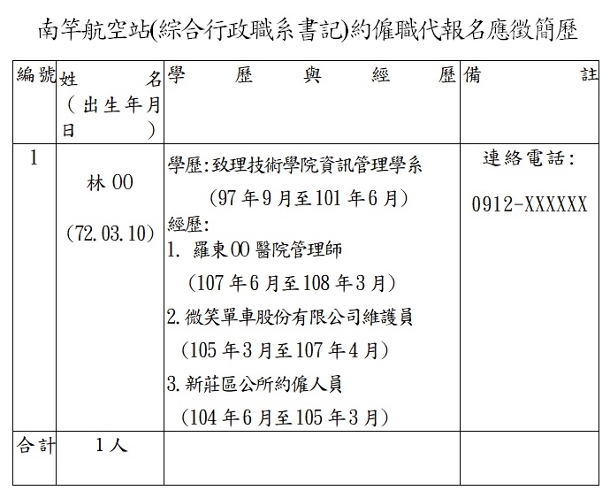 1.公務人員履歷表(請雙面列印並於填表人欄位簽名)、個人資料簡歷表、身分證正反面、最高學歷證件、工作經歷、專業證照、英檢等相關證明影本各1份(請以A4紙張影印),於110年8月18日下午5時(採紙本報名,以掛號郵戳為憑,逾期恕不受理)前寄達臺北國際航空站人事室(地址:臺北市敦化北路340之9號)收,信封上請註明應徵南竿航空站綜合行政書記約僱職務代理人及連絡電話(含行動電話)。