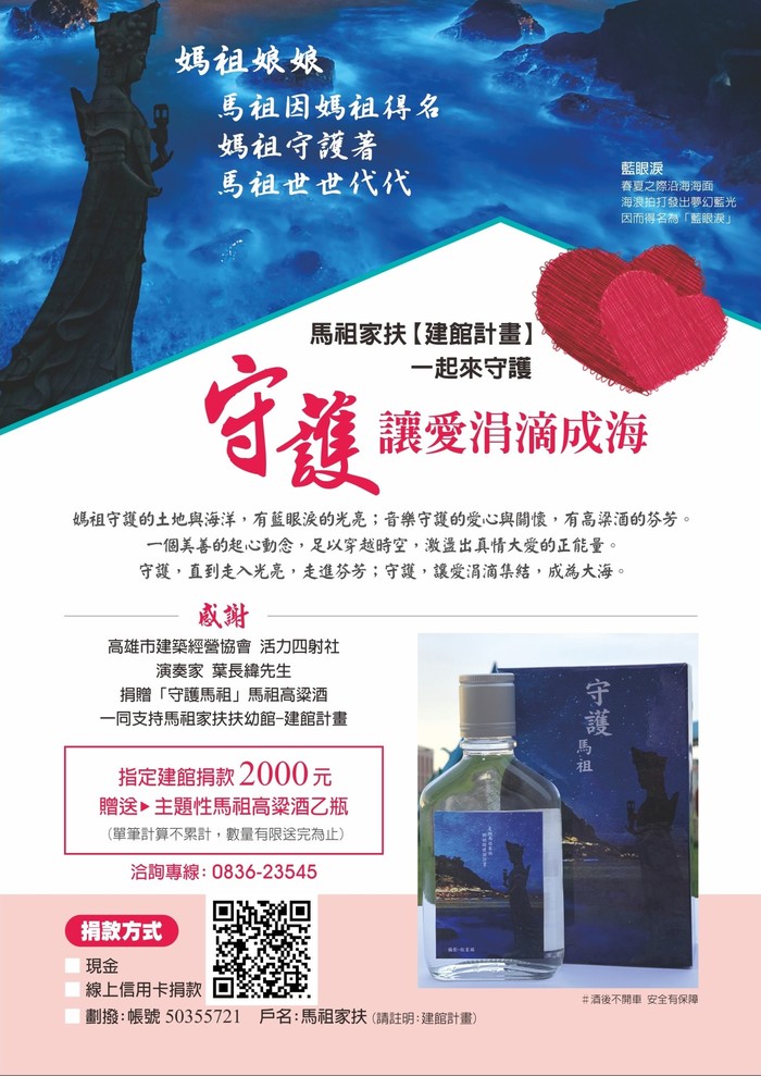感謝高雄市建築經營協會 活力四射社和演奏家葉長緯 先生大力支持,捐贈「守護馬祖」紀念酒,協助籌措馬祖家扶扶幼館建館專款。
