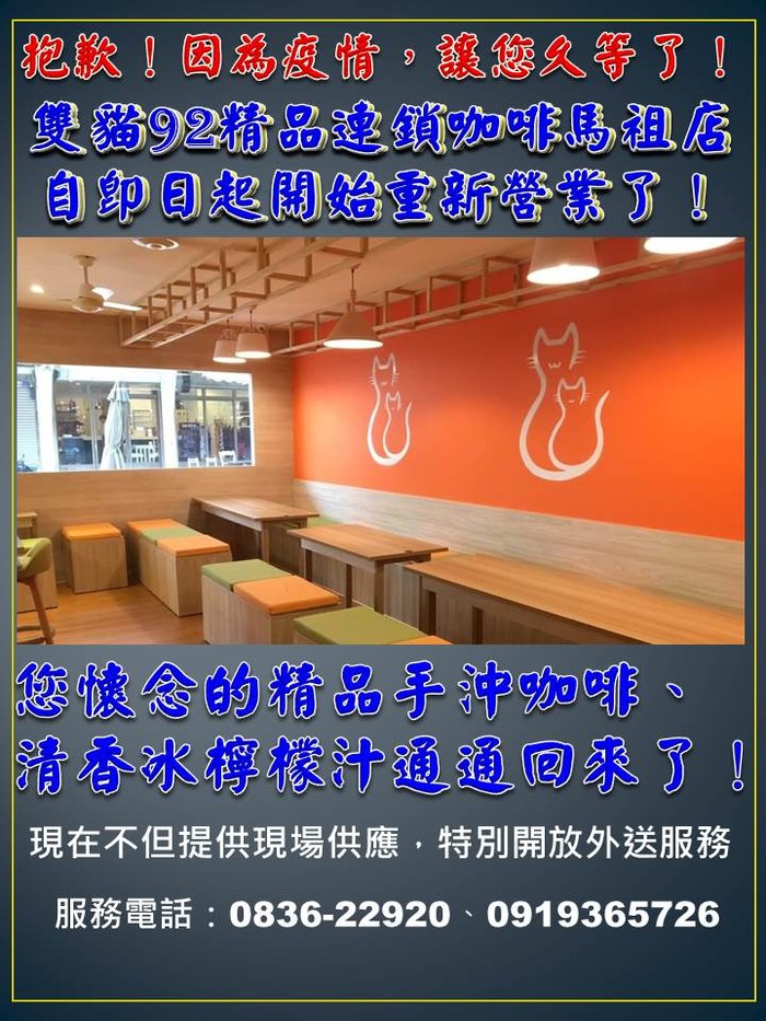 雙貓92精品咖啡馬祖店重新營業了