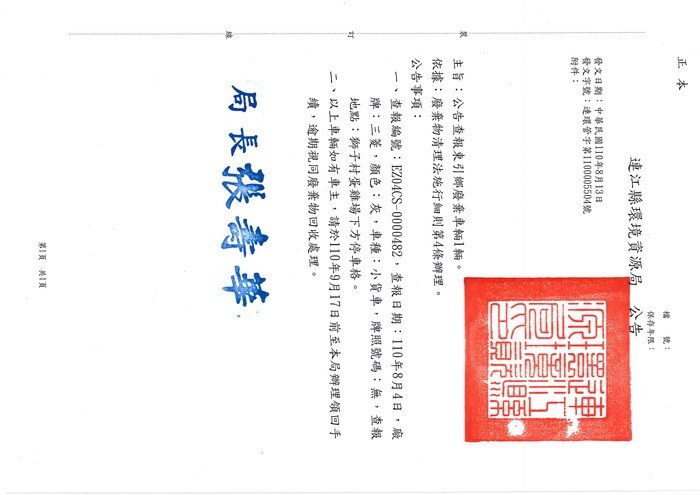 二、以上車輛如有車主,請於110年9月17日前至本局辦理領回手續,逾期視同廢棄物回收處理。