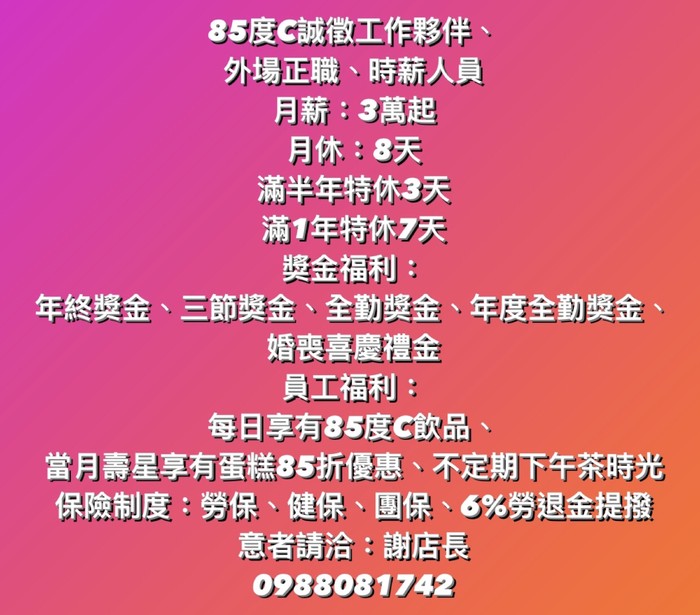 85度C誠徵工作夥伴 外場正職、時薪人員