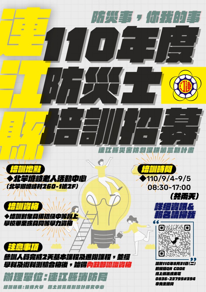 報名方式等詳情,請參酌下方連江縣110年度防災士培訓計畫海報,並掃描右下方QR碼進行報名。