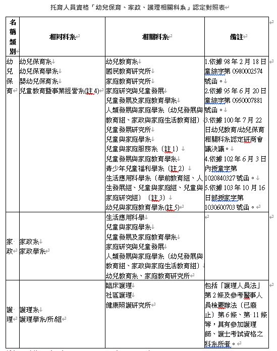 托育人員:高中【職】以上幼保相關科系畢業或具保母人員證照者。