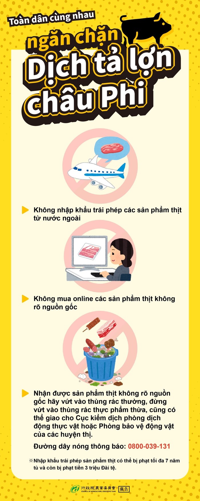 ※ Nhập khẩu trái phép sản phẩm thịt có thể bị phạt tối đa 7 năm tù và còn bị phạt tiền 3 triệu Đài tệ.