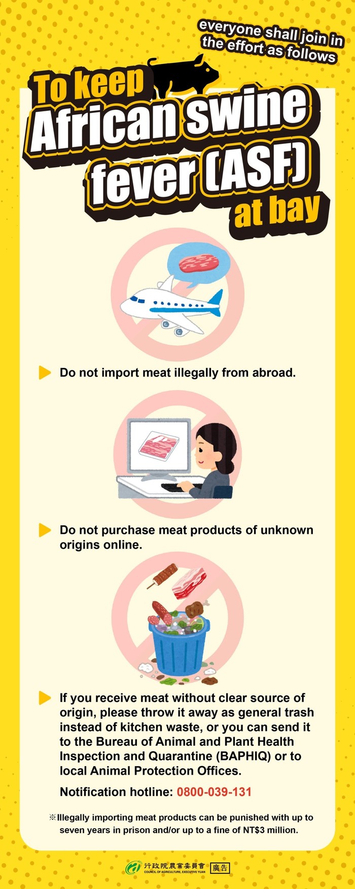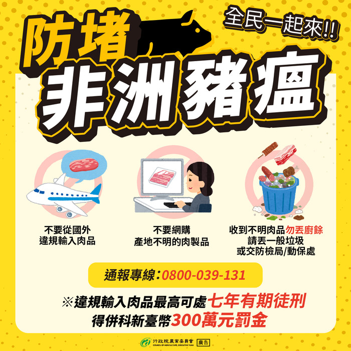 ※Illegally importing meat products can be punished with up to seven years in prison and/or up to a fine of NT$3 million.