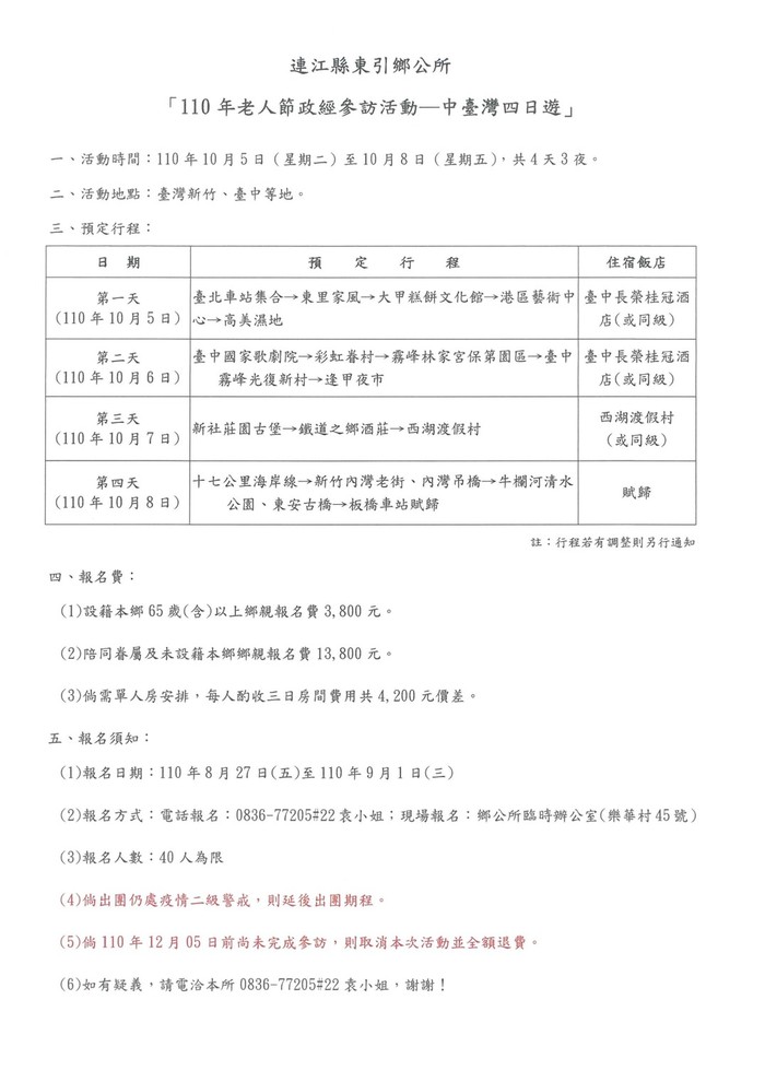 東引鄉老人節政經參訪活動 --閱讀人次 : 1005 110年老人節政經參訪活動─中臺灣四日遊