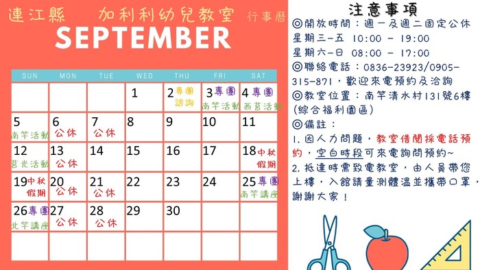 加利利教室 9 月份行事曆出來囉~