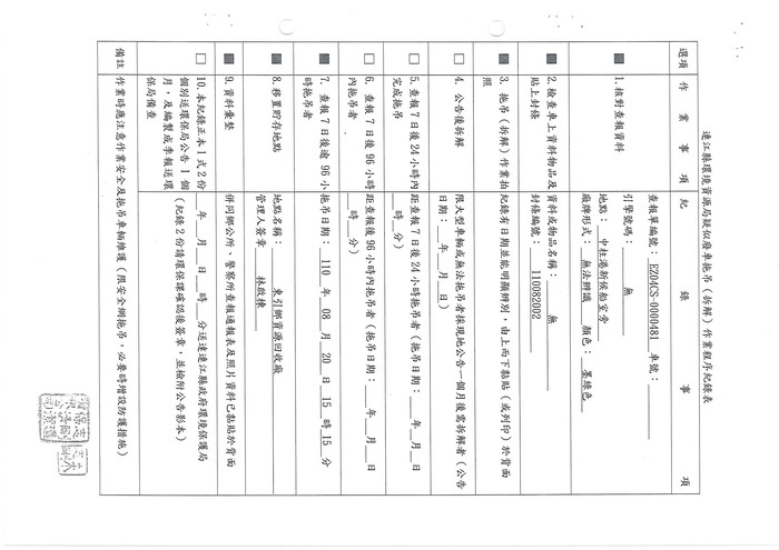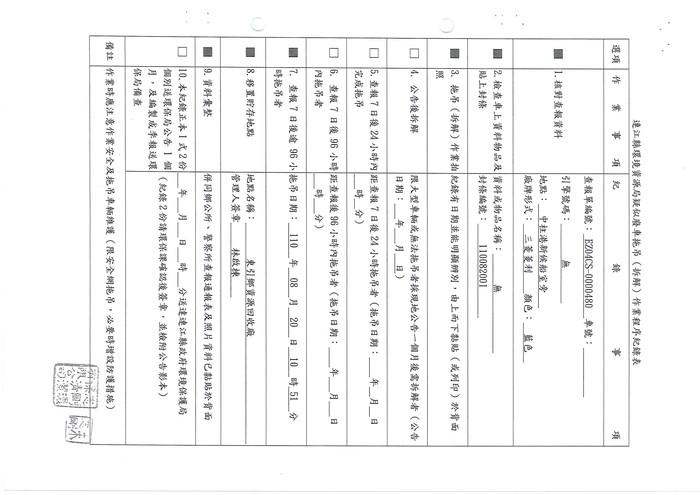 二、查報編號:EZ04CS-0000481,查報日期:110年8月12日,廠牌:無法辦識,顏色:墨綠,車種:機車,牌照號碼:無,查報地點:中柱港新候船室旁。