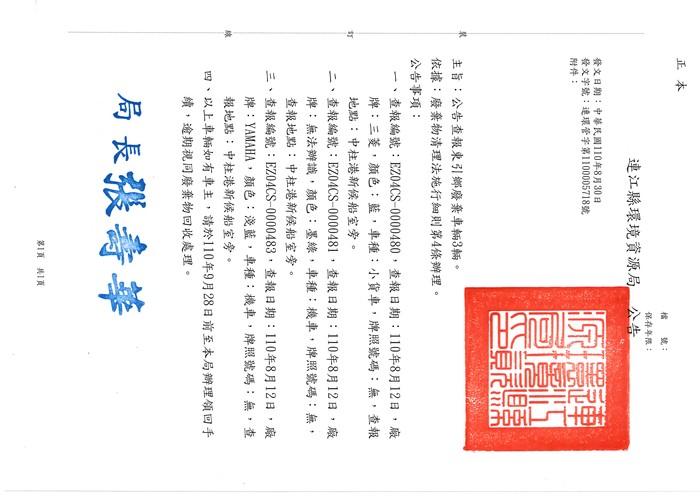三、查報編號:EZ04CS-0000483,查報日期:110年8月12日,廠牌:YAMAHA,顏色:淺藍,車種:機車,牌照號碼:無,查報地點:中柱港新候船室旁。