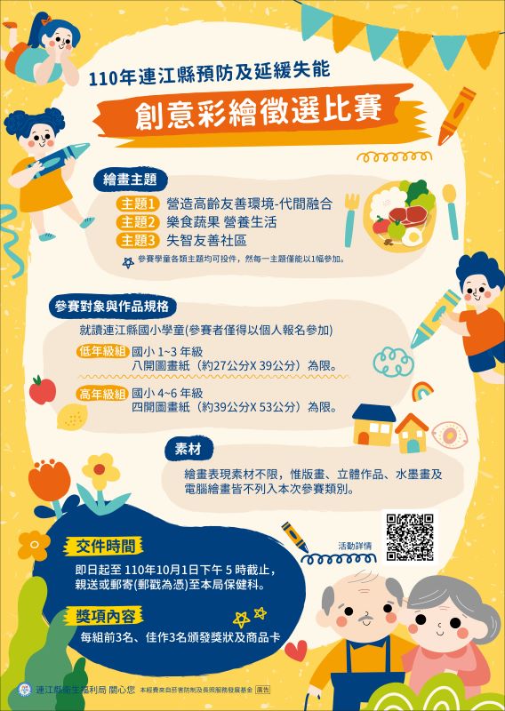 110年預防及延緩失能繪畫比賽開跑囉! --閱讀人次 : 752 為強化本縣學童對「高齡友善環境」、「營養生活」及「失智友善社區」相關議題的認識,本局辦理預防及延緩失能創意彩繪徵選比賽,即日起至110年10月1日(星期五) 下午 5 時截止報名,歡迎各位小朋友發揮創意,踴躍投稿參加,凡參加者即可得到參加獎乙份,還有機會獲得獎狀及商品卡唷!