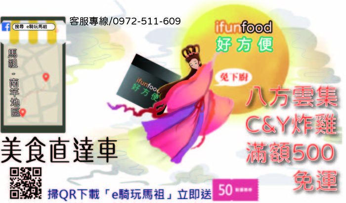 活動內容:凡是從「e騎玩馬祖」APP上訂購「八方雲集」、「C&Y炸雞飲料專賣店」外送滿500元者,免付50元外送費。
