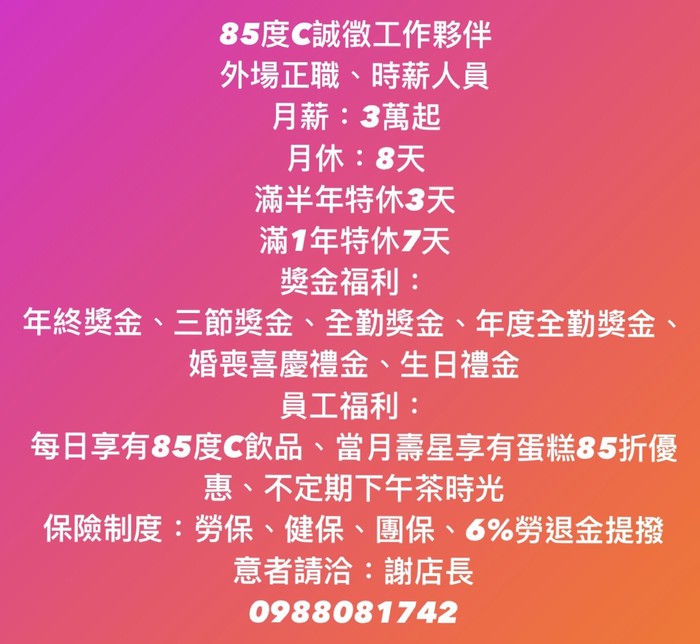 85度C誠徵工作夥伴 外場正職、時薪人員