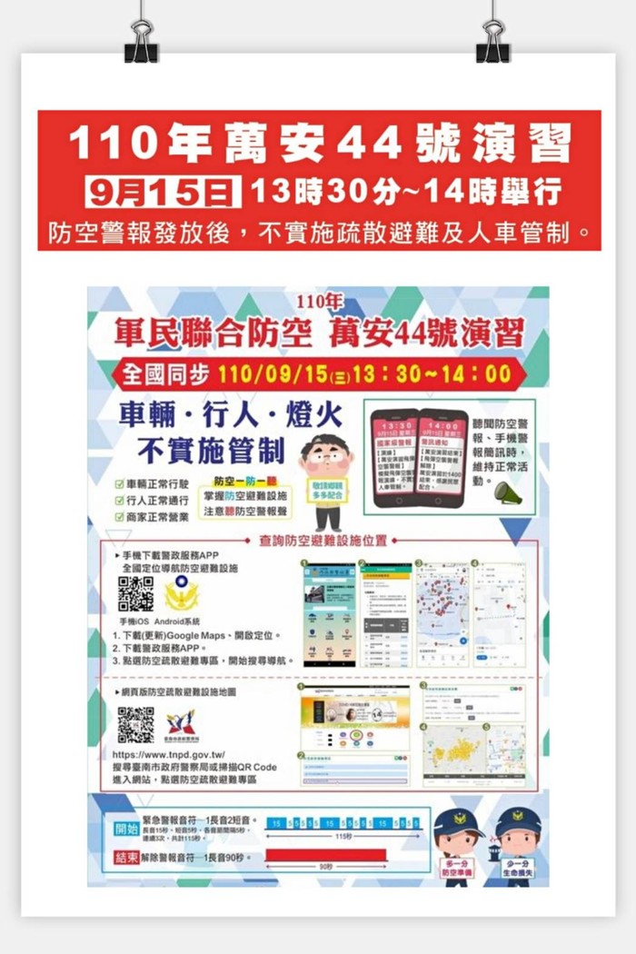 攸關國人防空演練的「萬安44號」演習將於9月15日13時30分至14時止同時段方式實施30分鐘.考量我國仍處防疫期間.為遵循「中央流行疫情指揮中心」防疫指導,因此演習僅發放防空警報及「空中威脅告警系統」手機警訊,不實施人.車管制及疏散避難演練。