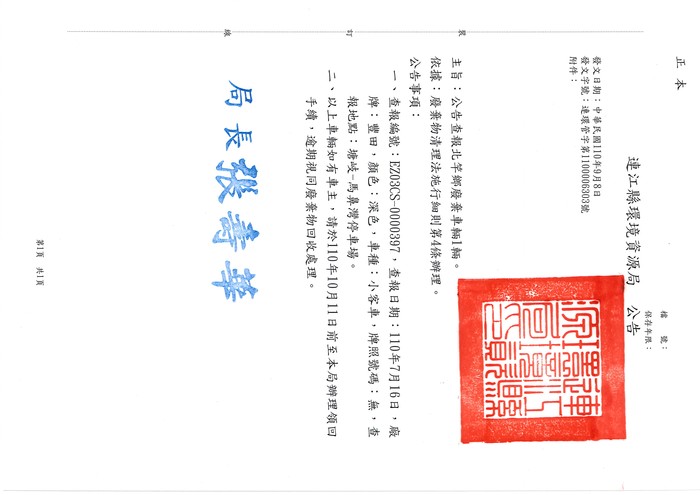 二、以上車輛如有車主,請於110年10月11日前至本局辦理領回手續,逾期視同廢棄物回收處理。