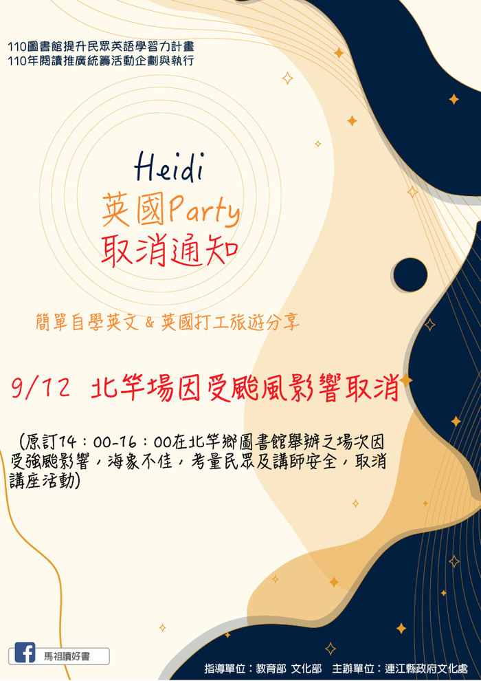 原訂9/12(日)下午2-4點在北竿鄉圖書館之Heidi英國分享講座,