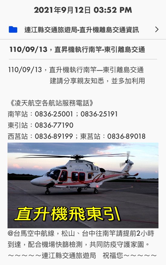9/13東引直昇機航班公告