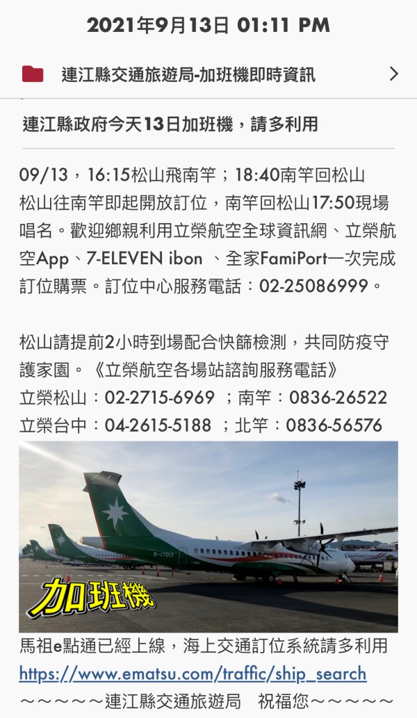 加班機開放訂位 16:15松山飛南竿、18:40南竿往松山